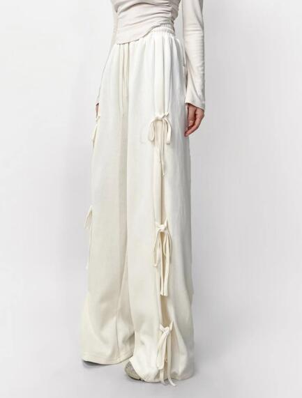 -Drawstring waistband-Bow details on the sides -Wide leg bottom